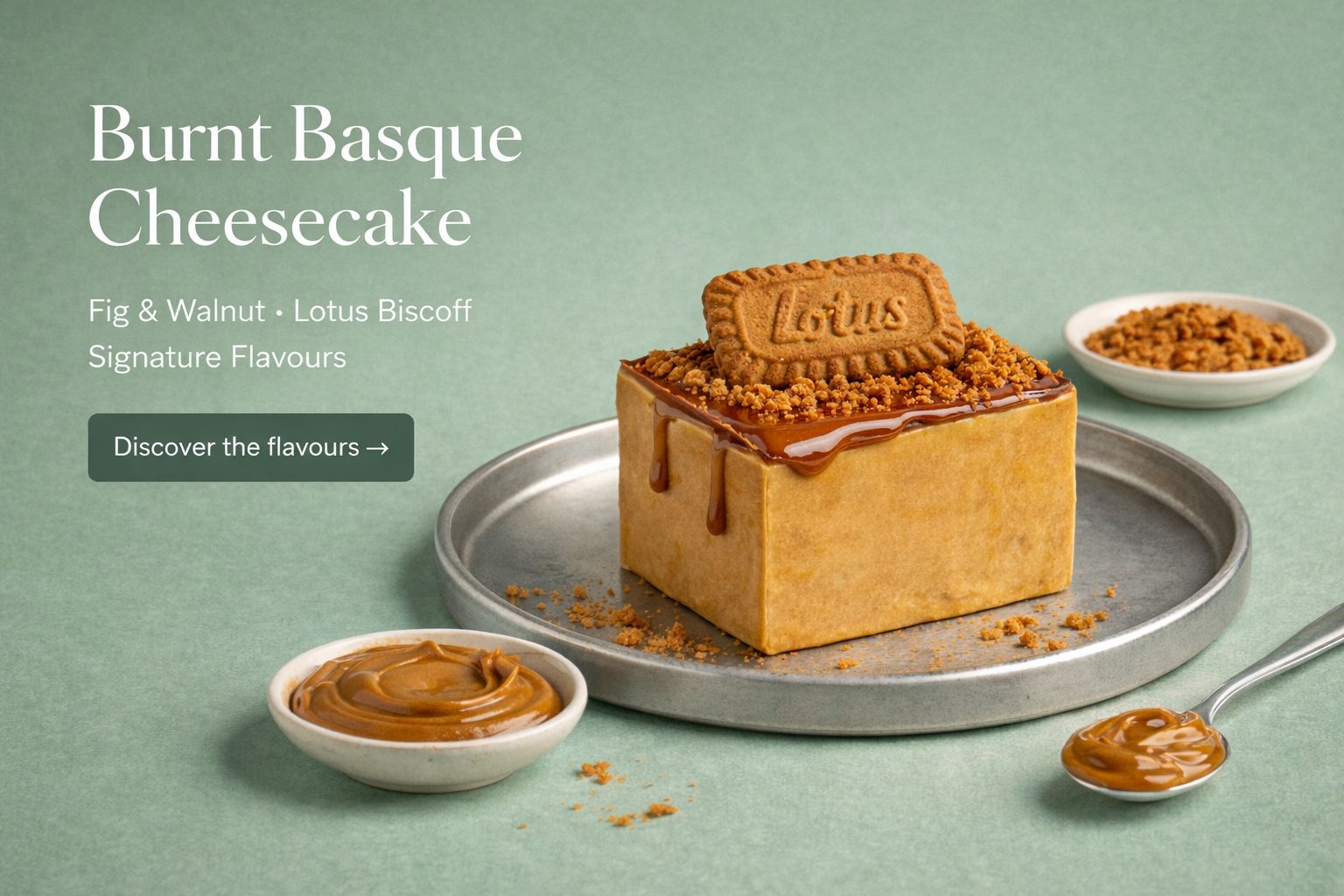 A rich twist on a modern classic. Our Caramel Basque Cheesecake features the iconic caramelized “burnt” top with an extra layer of deep, buttery caramel flavor. Baked at high heat for a bold exterior, the inside stays luxuriously creamy with a smooth, custard-like texture that melts on the tongue.
